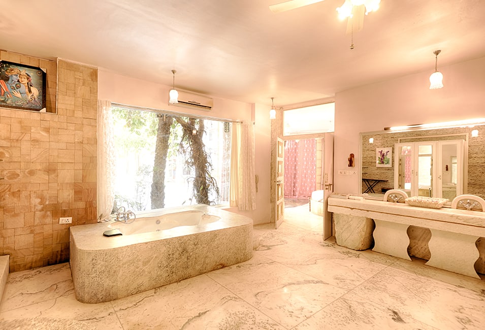 The villa includes five rooms, and the sharp contrast between the furnishings and the marble walls gives this room a contemporary yet regal aesthetic, with an outside private pool surrounded by towering trees and foliage, birds chirping in your ear, and a picturesque view of the Aravalli hills.