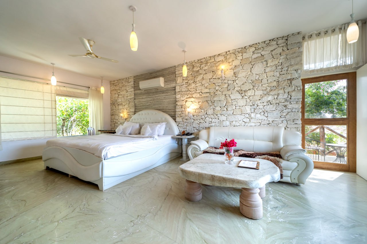 The luxury suite, rich in textures and colors, will provide you with comfort, replete with a marble floor, a marble king size bed, stone walls, and an indoor Jacuzzi to rejuvenate your senses. This luxurious suite with bedside tables adds symmetry to the modern bedroom with stone walls.