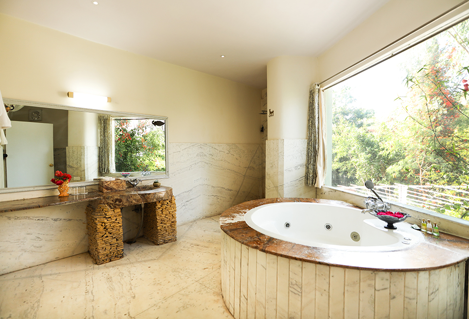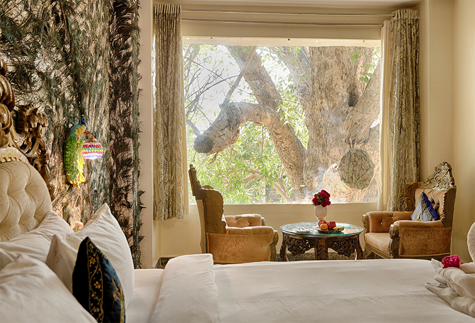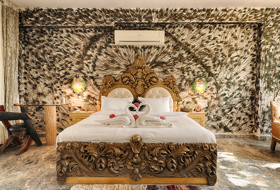 The peacock room is a piece of art with a rich and unified palette of vibrant original blue-green peacock feathers, an indoor jacuzzi, and a King-Size bed.