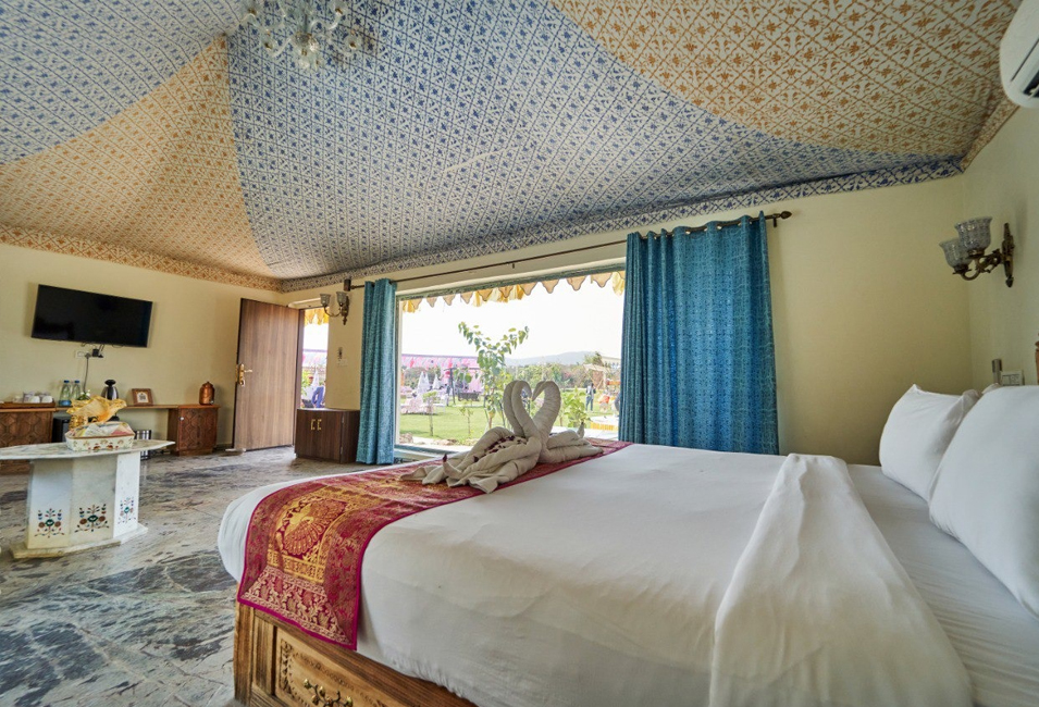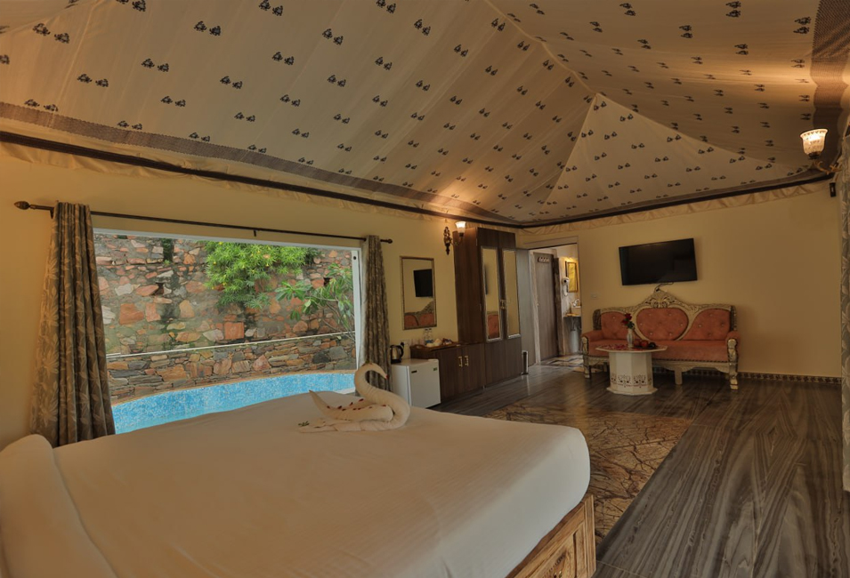 Our Luxury Tents with Outdoor Pools at Lohagarh Fort Resort and Spa are designed to offer our guests a comfortable and luxurious stay in a natural setting. Our tents are spacious and well-appointed, equipped with modern amenities such as air conditioning, flat-screen TVs, comfortable beds, and a seating area. The private outdoor pool is an added luxury that allows guests to relax and enjoy the serene surroundings while rejuvenating their senses. Our resort is nestled in lush greenery and offers breathtaking views of the Aravalli hills. It is one of the